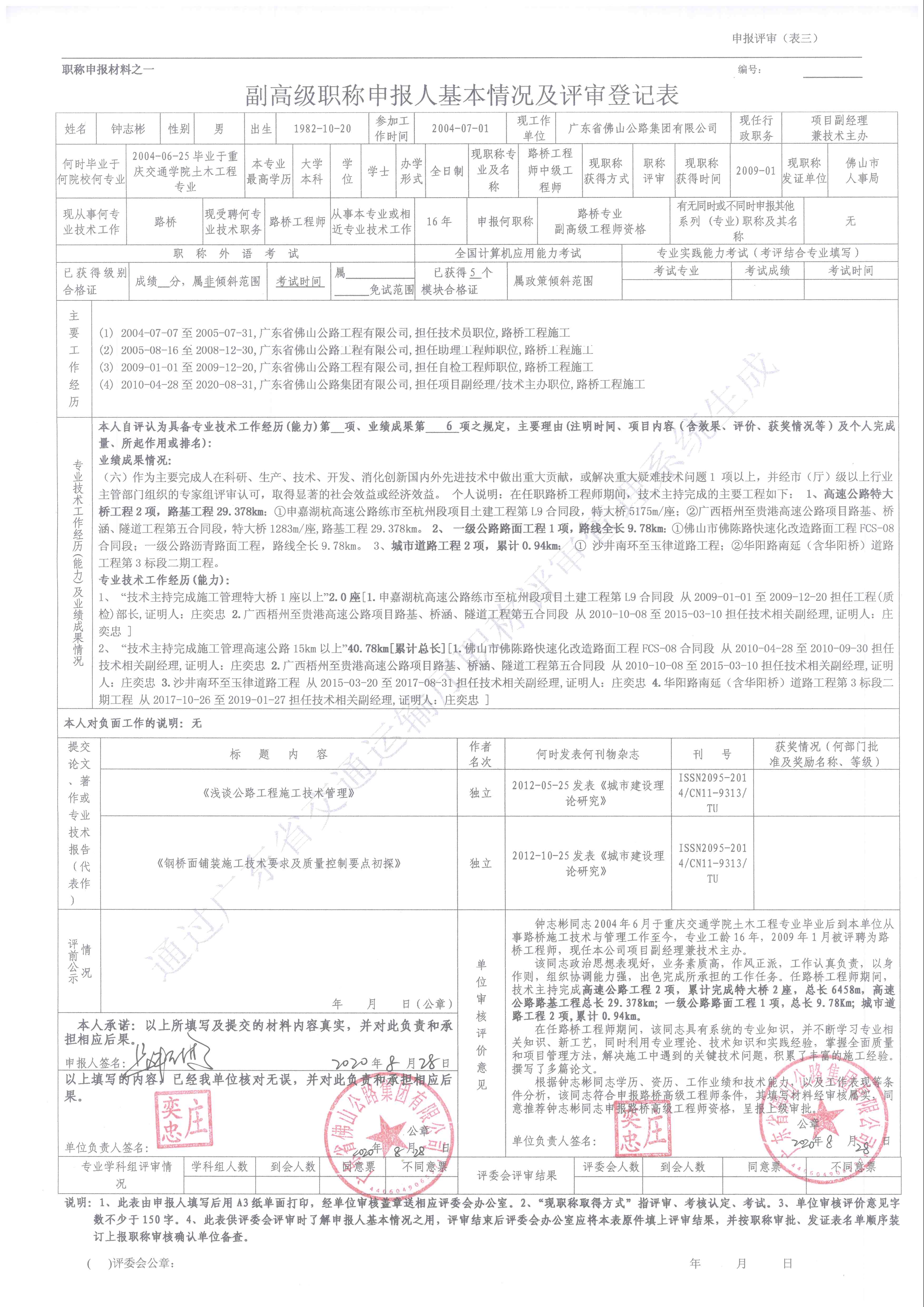 根据《广东省交通运输厅关于做好2020年度交通运输工程高级职称评审材料报送工作的通知》(粤交人函[2020]477号)精神,为确保职称评审的公平公正,根据职称评审审批程序及有关政策规定,现对钟志彬等人《副高级专业技术资格申报人基本情况及评审登记表》进行评前网上公示。公示时间为8个工作日(2020年8月31日至2020年9月9日),公示期间内如有异议者,可通过电话等形式向公司人力资源部反映。